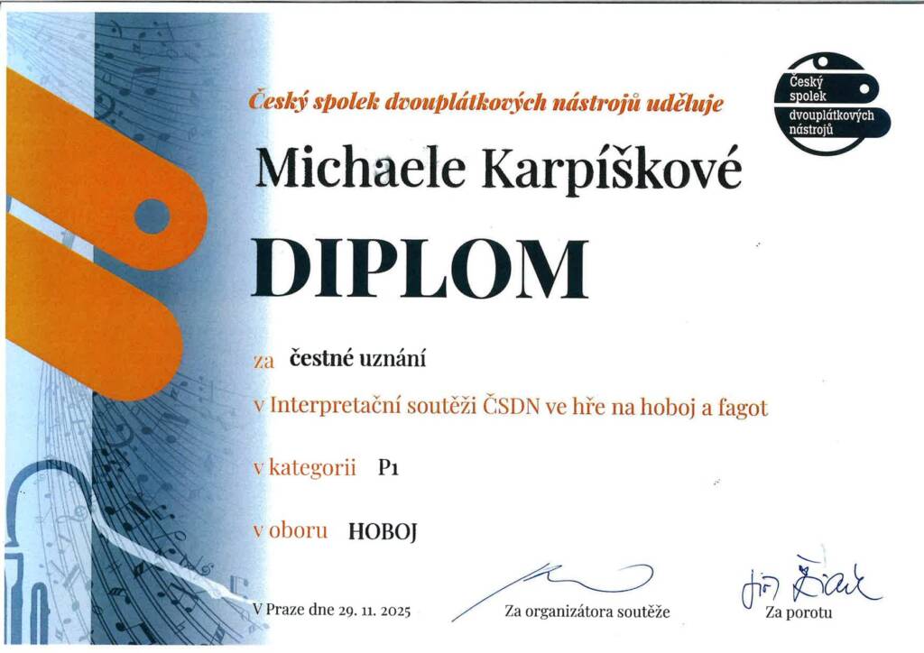 V sobotu 29. listopadu 2025 se konala v Praze Interpretační soutěž ČSDN ve hře na hoboj a fagot. Studentka 1. ročníku Michaela Karpíšková získala v kategorii P1 čestné uznání. Student 4. ročníku Jonáš Borský získal 1. místo a cenu nejlepšího účastníka kategorie P2.