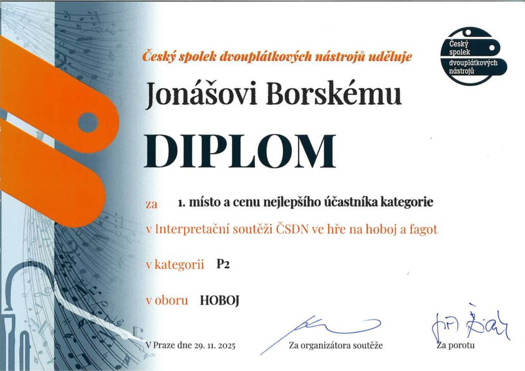 V sobotu 29. listopadu 2025 se konala v Praze Interpretační soutěž ČSDN ve hře na hoboj a fagot. Studentka 1. ročníku Michaela Karpíšková získala v kategorii P1 čestné uznání. Student 4. ročníku Jonáš Borský získal 1. místo a cenu nejlepšího účastníka kategorie P2.