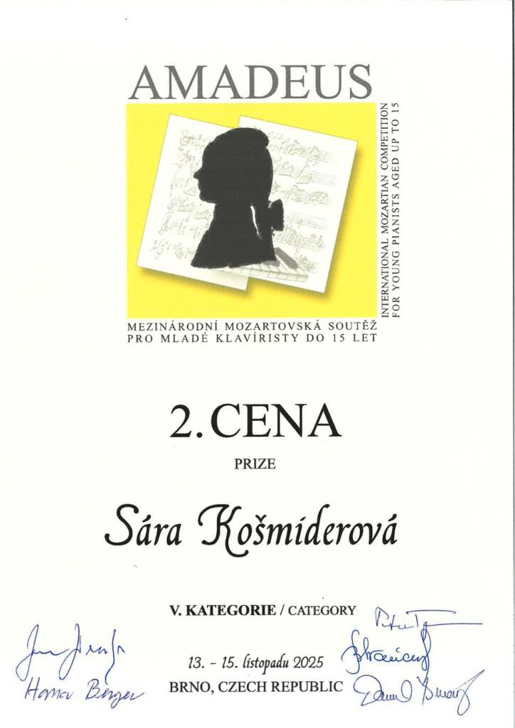 Ve dnech 13.-15. října 2025 se konal 32. ročník Mezinárodní klavírní soutěže Amadeus Brno. Studentka 1. ročníku Sára Košmiderová z klavírní třídy prof. Martiny Schulmeisterové získala v V. kategorii krásnou 2. cenu. Oběma moc gratulujeme!